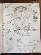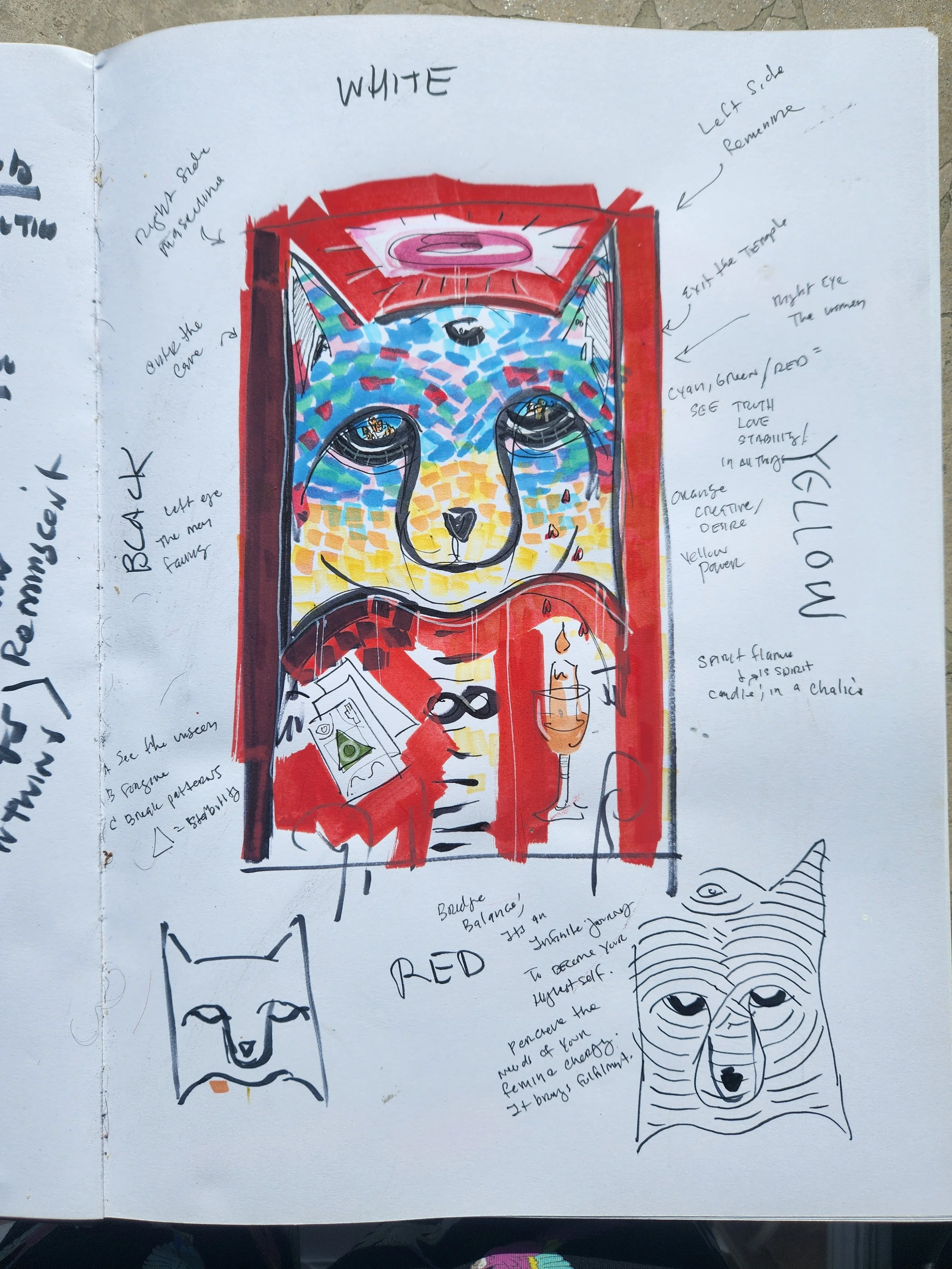 The fox reflects his natural character; the phoenix reflects the change rising within him. Blue and yellow strokes around the eyes reveal the limits around will and personal power he is learning to release. The masculine influence appears in the left eye; his daughter’s quiet, enduring support appears in the right. Seven marks at the base form the spine he must climb, centered by the compassion tree that guides his growth. The left ear is the cave; the right ear is the temple—enter, see clearly, burn away the old, and step out renewed. The cards on the left mark the material work. The cup on the right marks the spiritual renewal that follows when he frees himself.