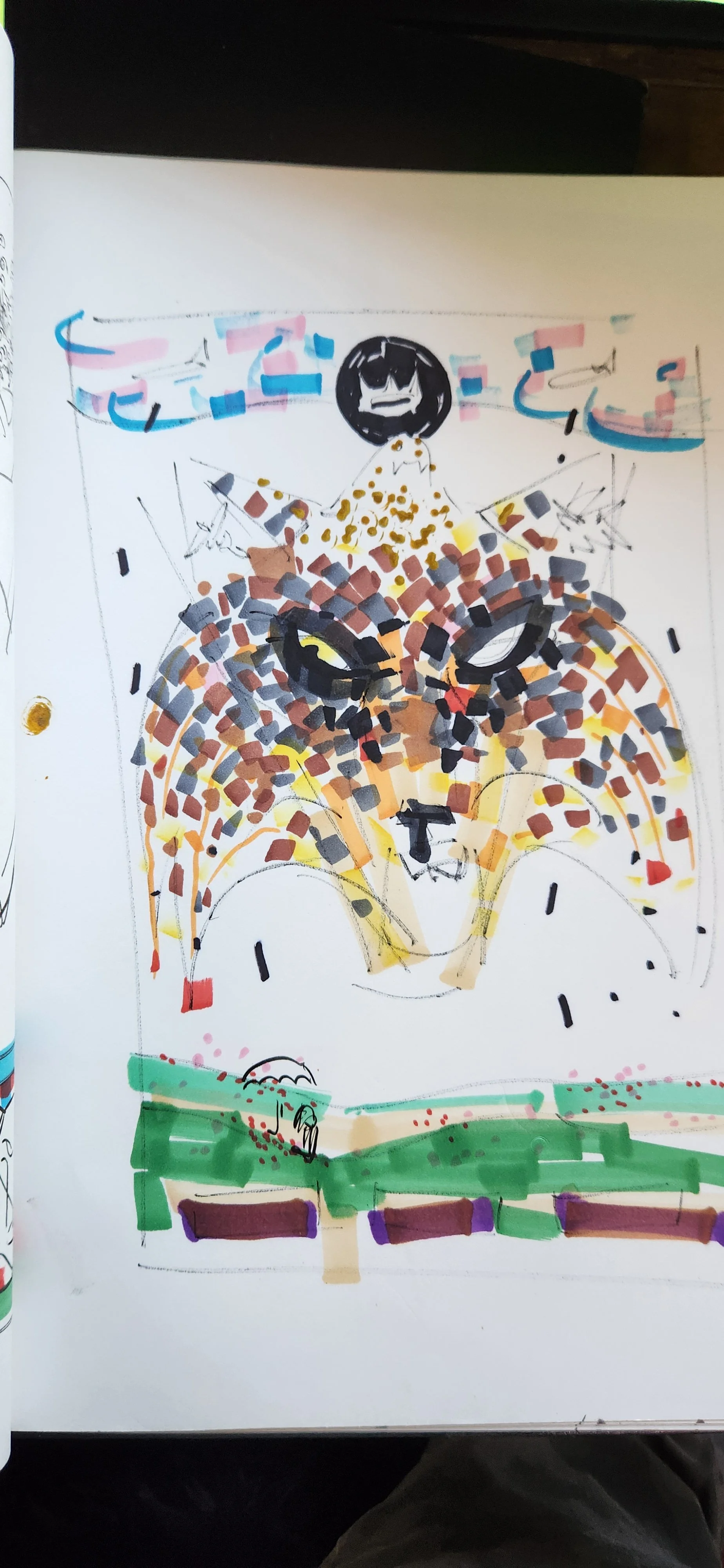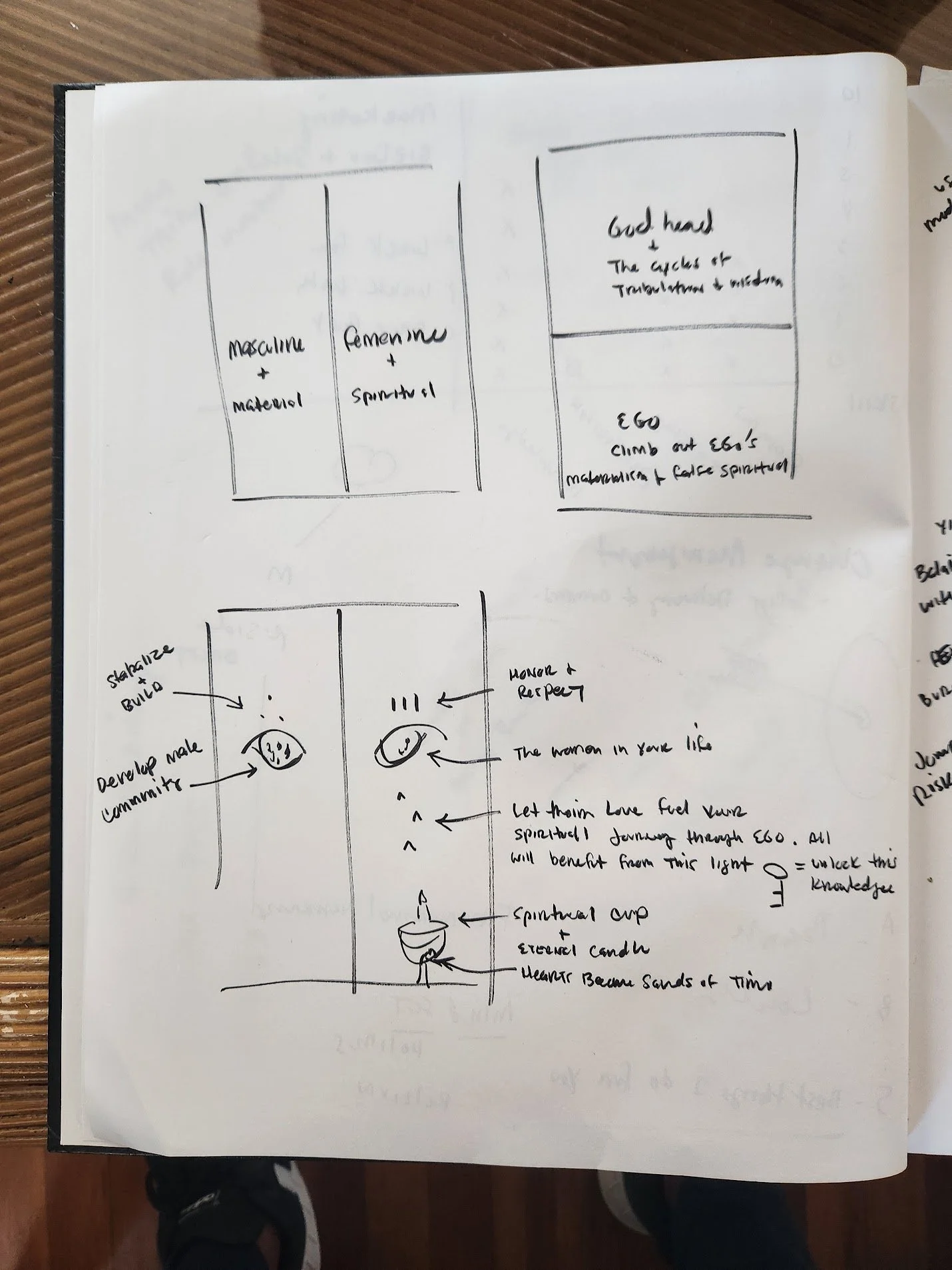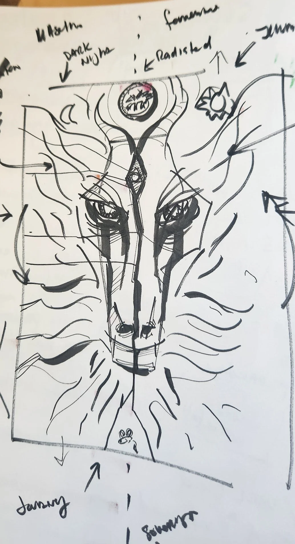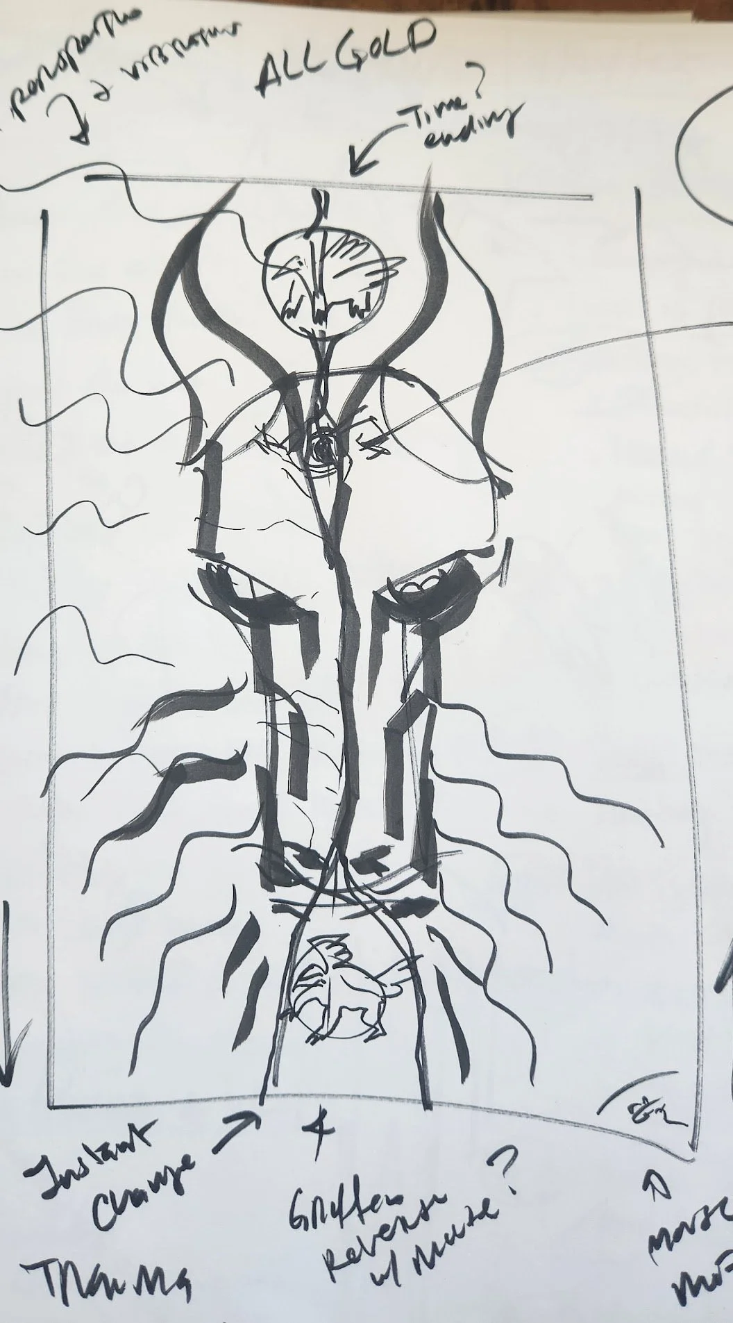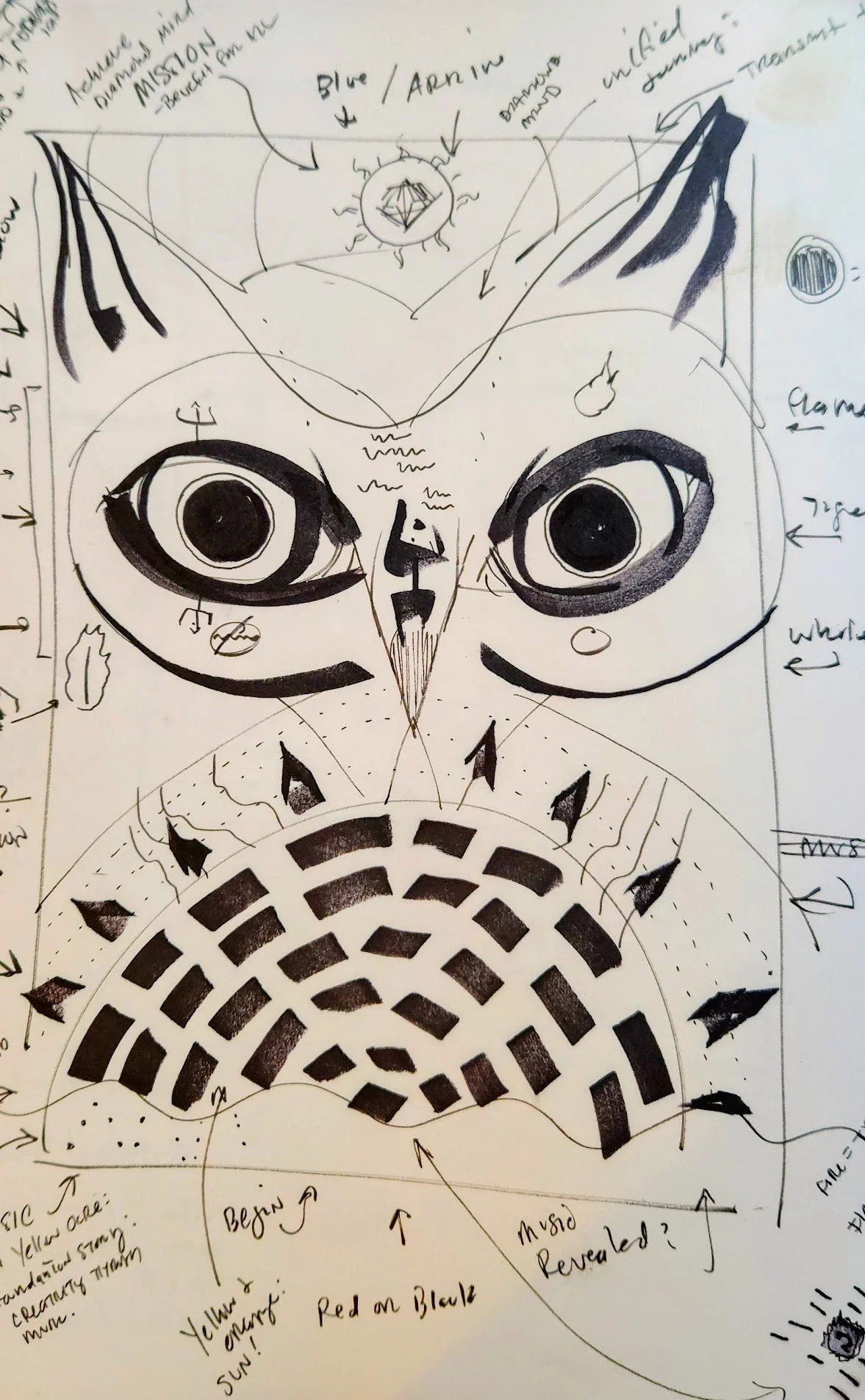 The owl at the top is the Watcher—the part of him that sees everything with sober, steady awareness. Beneath it is the Shadow Mask, the place where the pain lived. Above both is Perseverance, arms wrapping the eyes in prayer, legs braced across the shadow to hold it still.