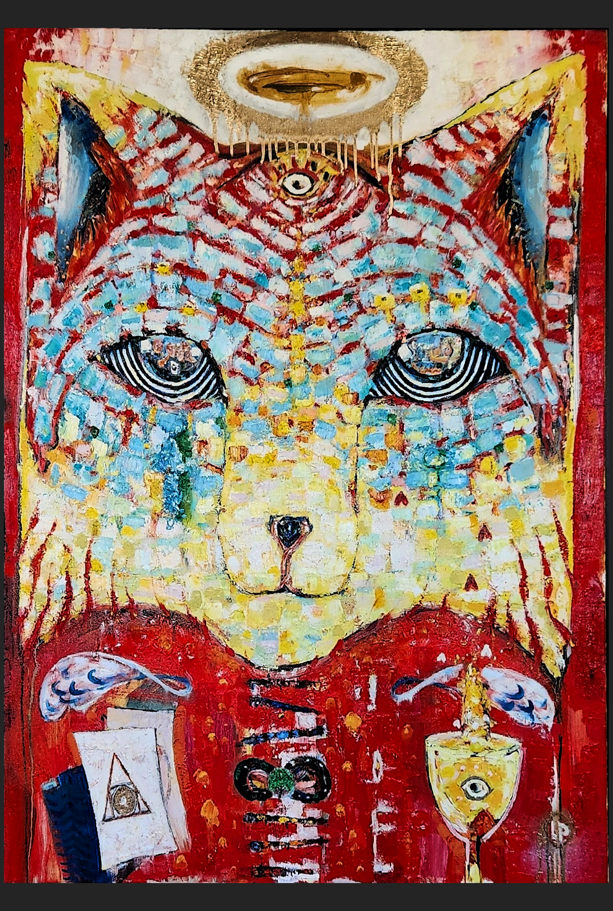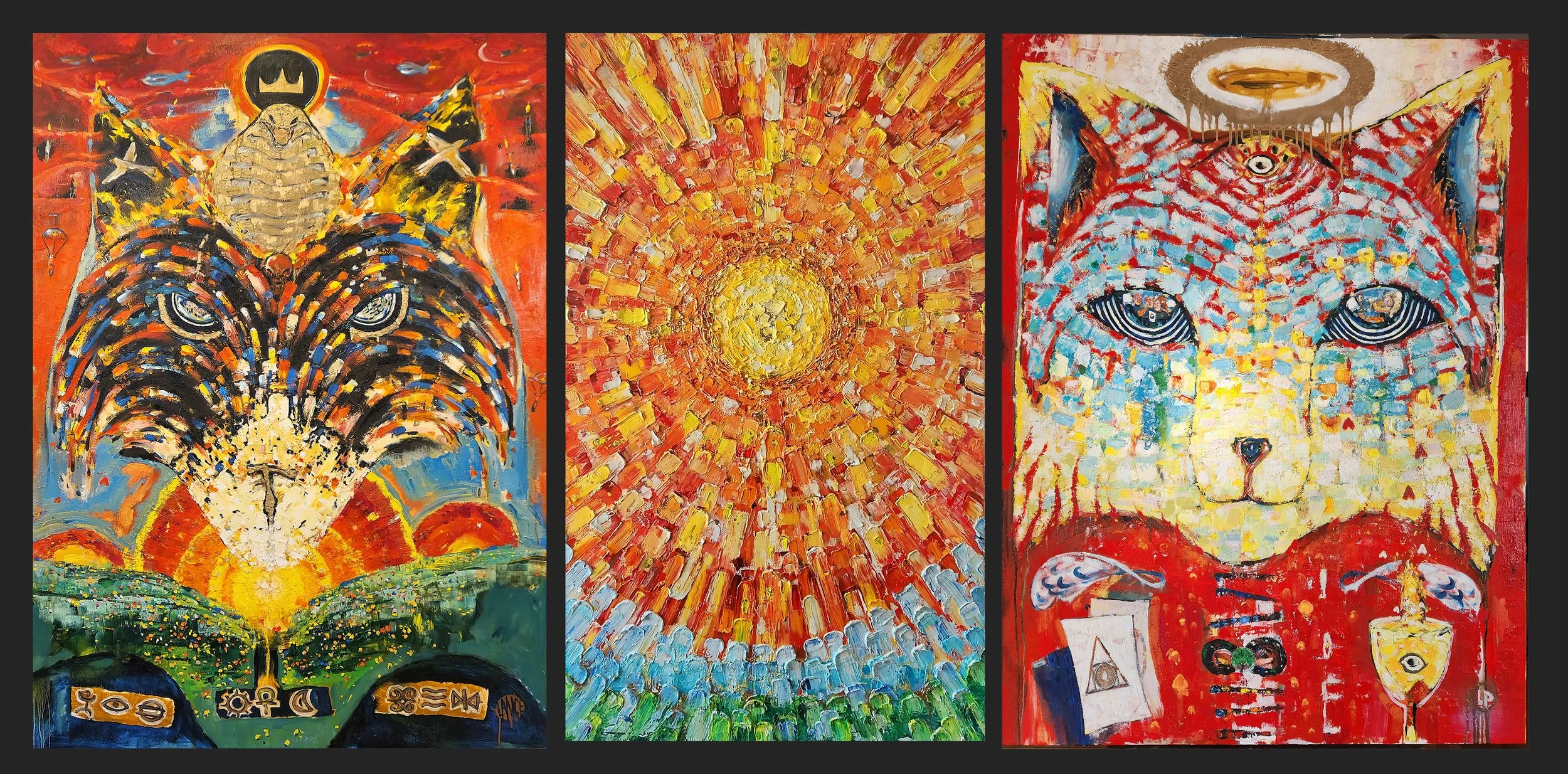The sun erupts across the land, fracturing into a broken ankh, the symbol of life split by the pursuit of gold. One piece becomes the wolf’s nose, the others its eyes. The masculine eye holds a broken sword; the feminine eye holds a crumbling rook. Both reveal how violence and greed separate men and women and weaken their shared power. Beneath the land lie tombs and artifacts, including nine symbols that anchor the painting’s key message: people awaken and forgive the cycles of life through strength, justice, patience, and alignment.