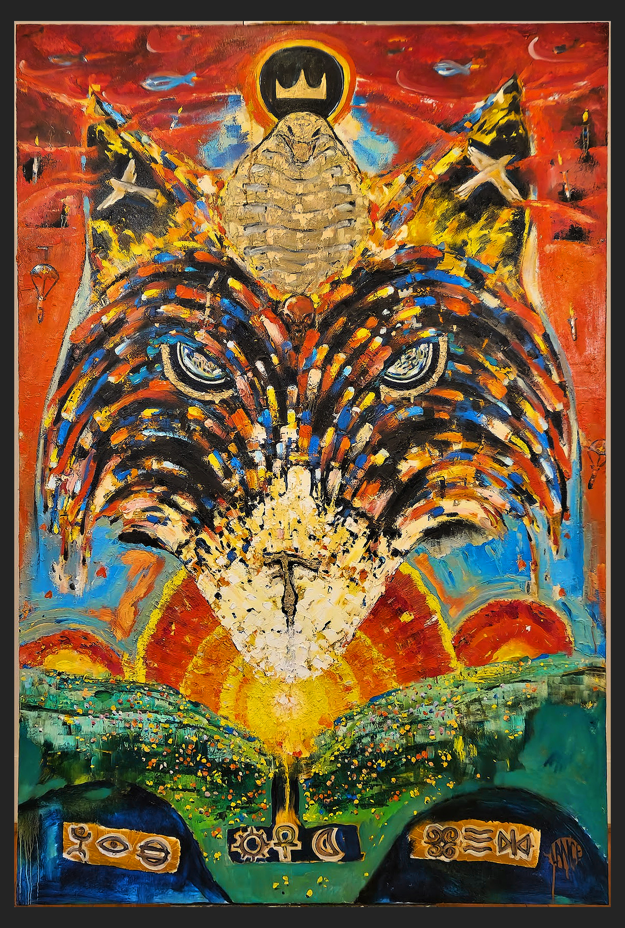 These paintings are psychological mirrors built through story and symbol. They explore war and hope, ego and self, collapse and coherence. The Wolf, the Snake, the Fox, the Phoenix, and the birds are not fantasy. They are behavioral archetypes. Planes turn to clouds. Bombs fall like rain. Graves hold hearts that still bloom. Violence and regeneration share the same frame.