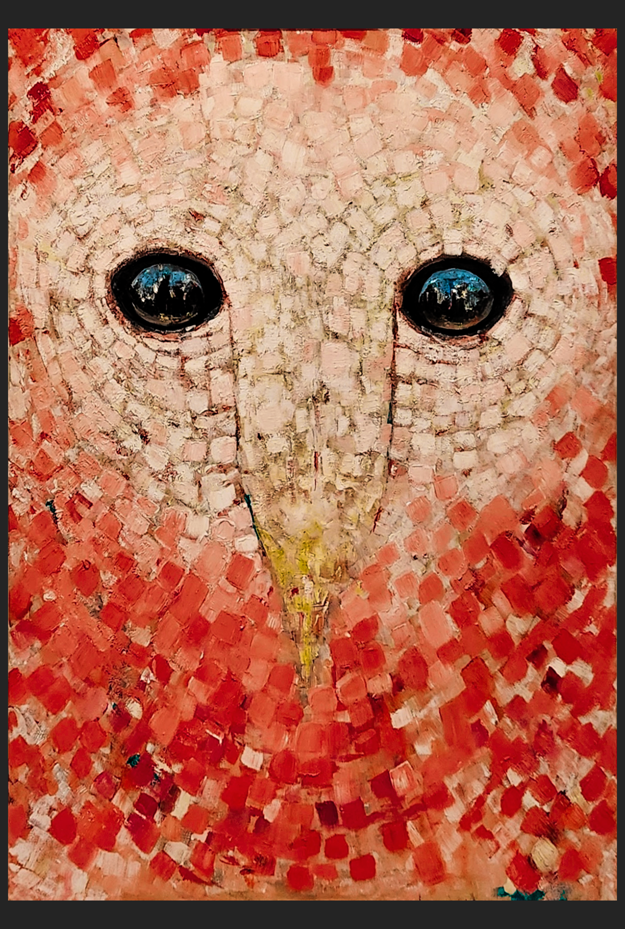 The eyes burn with the end of civilization. Trial by fire. Cities reduced to plume and ash. The owl sits just outside the blast, untouched in body, yet implicated in meaning. Its feathers fragment into individual lives. Each plume a person. The beak and facial structure form the explosion itself. The breaking point made visible.