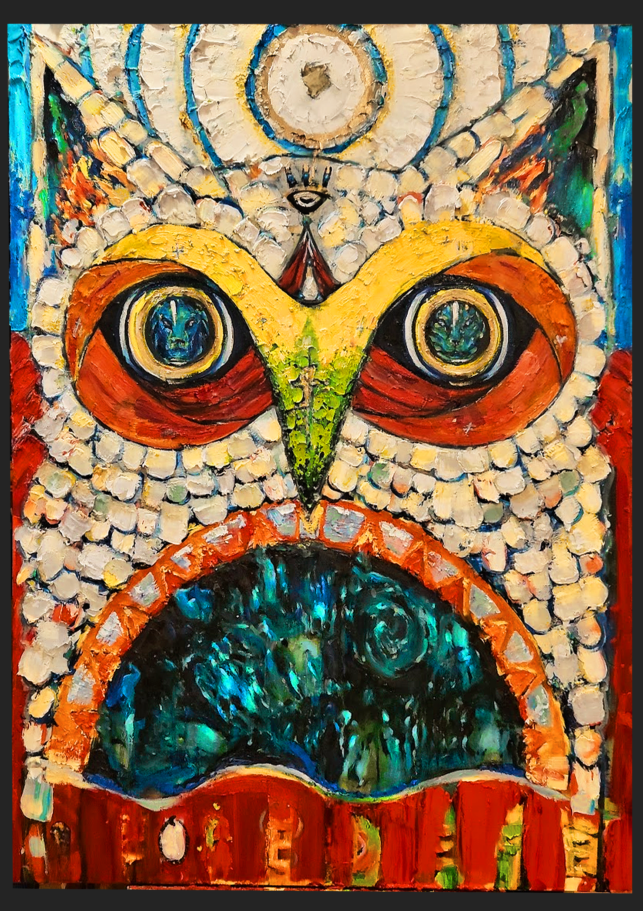 The pit below is the illusion, the place where fear wants to pull him. Its swirling blues form the forge where his old selves died and were remade. D.E.F.E. across the base marks the death-theme that illuminated his path through darkness. The owl’s feathers double as the stone tablets of limiting beliefs he must break. The arrows and looping marks around the eyes represent the upper and lower death drives, teaching him how to rise without being pulled back. At the center glows the eye of becoming, a reminder that real leadership isn’t performed; it is embodied.